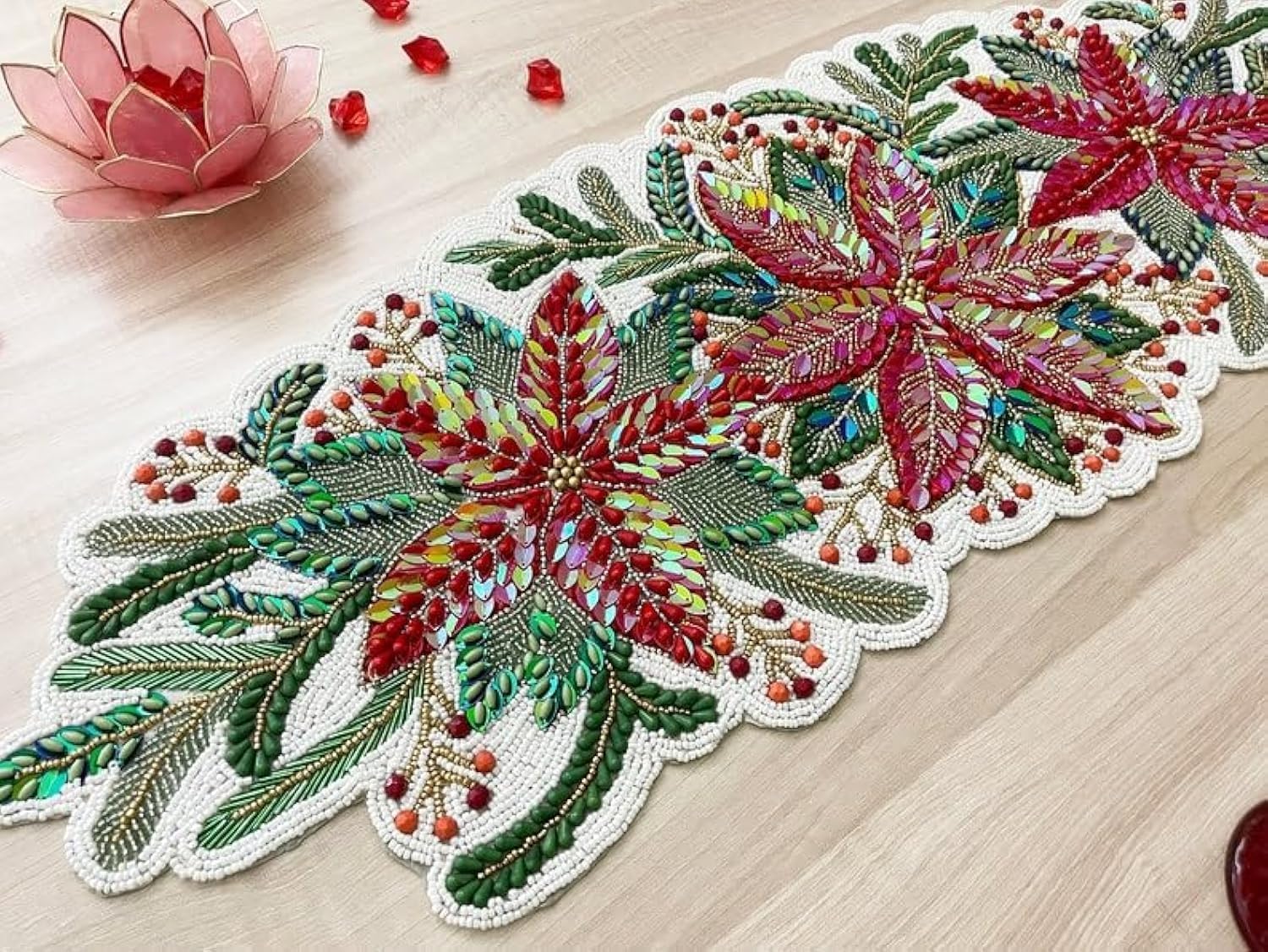 • Subtle Sparkle: Delicately embedded beads create a subtle shimmer, catching the light and enhancing the visual appeal of your table. Easy Maintenance: Designed for practicality, the beaded table runner is easy to clean and maintain, making it a functional yet stylish addition to your decor.